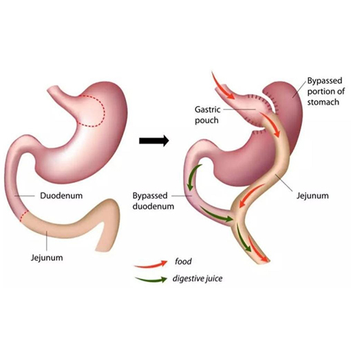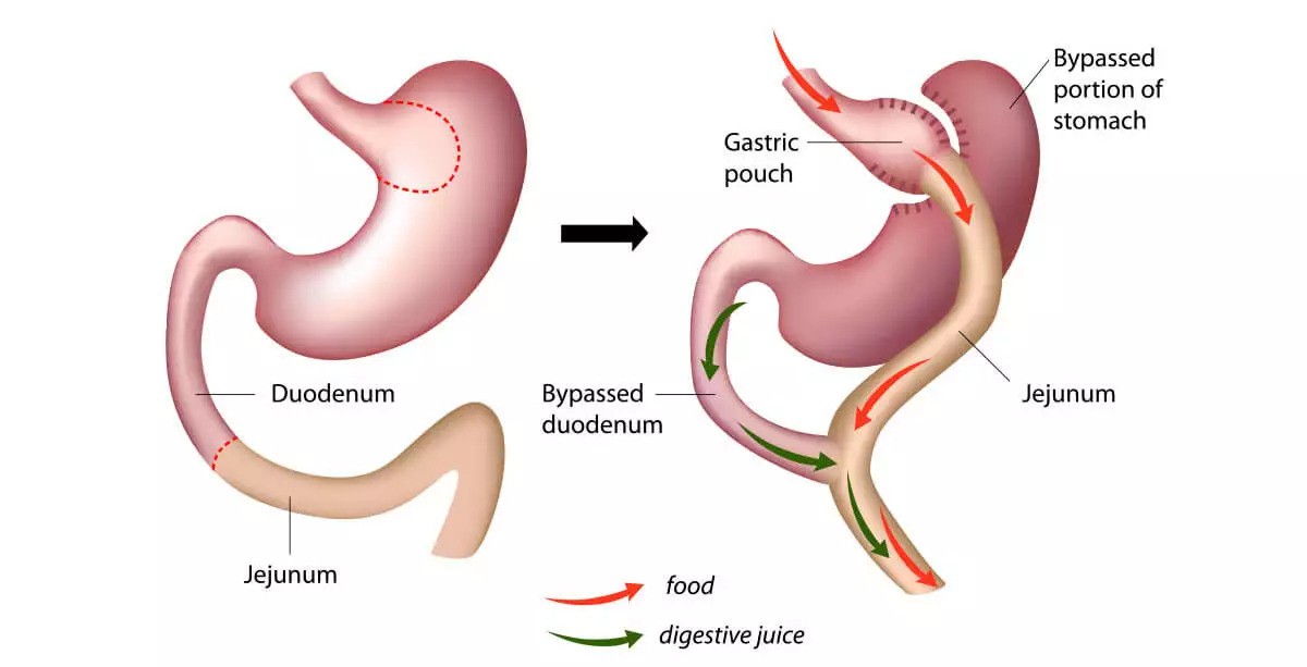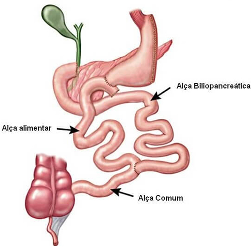 - Desvio intestinal – o duodeno é conectado a uma parte mais distante do intestino delgado, diminuindo de forma significativa a absorção de calorias, gorduras e nutrientes.